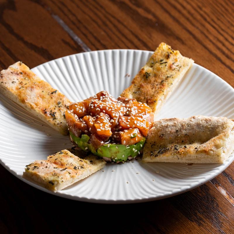 7 oz of pan seared octopus served with aromatic oil, lemon sauce over sliced marinated potatoes.